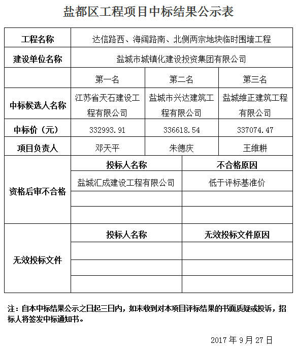 达信路西、海阔路南、北侧两宗地块临时围墙工程中标结果公示