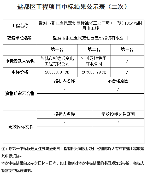 盐城市张庄全民双创园标准化工业厂房(一期)10KV临时用电工程中标公示