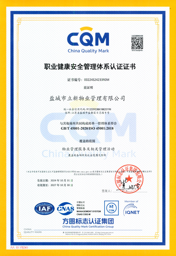 近日,盐城市立新物业管理有限公司传来喜讯,经过三个月的精心筹备与不懈努力,立新物业公司顺利通过了质量管理体系ISO9001、环境管理体系ISO14001、职业健康安全管理体系ISO45001资质认证。